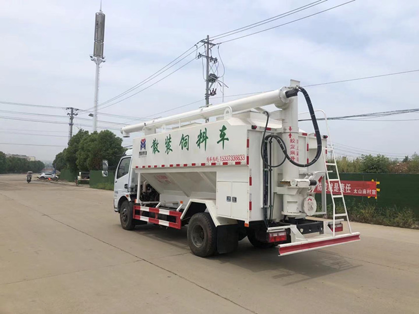 散裝飼料運(yùn)輸車(chē),散裝飼料車(chē)的飼料罐架設(shè)在卡車(chē)的底盤(pán)上,罐頂開(kāi)有進(jìn)料口.頂部的一根螺旋輸送卸料管(俗稱卸料絞龍)則可自由回轉(zhuǎn)和抬升,抬升的仰角可達(dá)60度。運(yùn)輸時(shí),頂部的螺旋管平臥在罐頂;卸料時(shí)則抬起,使管端的出料口與畜禽飼養(yǎng)場(chǎng)貯料罐頂部的進(jìn)料門(mén)相接,駕駛室內(nèi)裝有操縱裝置(操縱裝置也可裝置在罐體尾部),卸料時(shí)通過(guò)車(chē)底的動(dòng)力輸出軸和減速器來(lái)驅(qū)動(dòng)螺旋,以完成卸料。